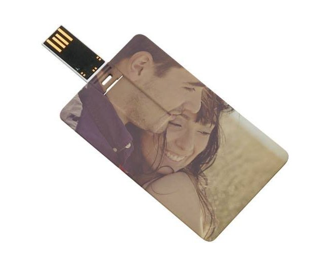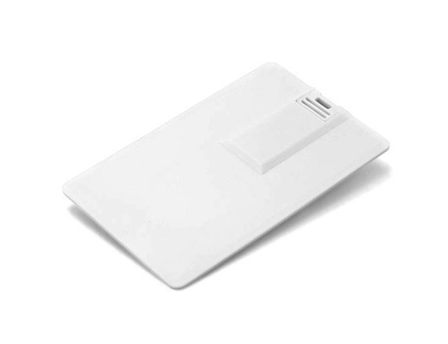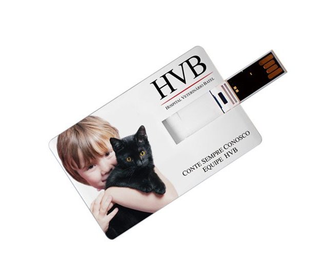 Pen drive formato cartão, material em plástico resistente, acabamento frontal liso e parte traseira com relevo do suporte. Personalizado com a sua logomarca.