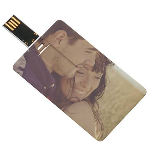 Pen drive formato cartão, material em plástico resistente, acabamento frontal liso e parte traseira com relevo do suporte. Personalizado com a sua logomarca.