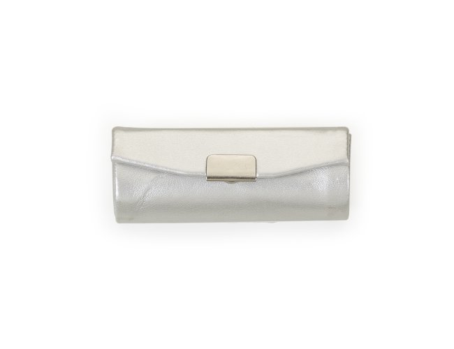 Porta batom em couro sintético prata com plaquinha de metal frontal com botão para abrir/fechar, possui um espelho interno.