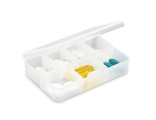 Porta comprimidos com tampa e 7 divisórias, ideal para separar pelos dias da semana. Food grade. 85 x 55 x 20 mm