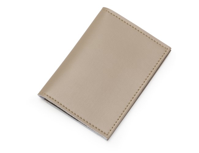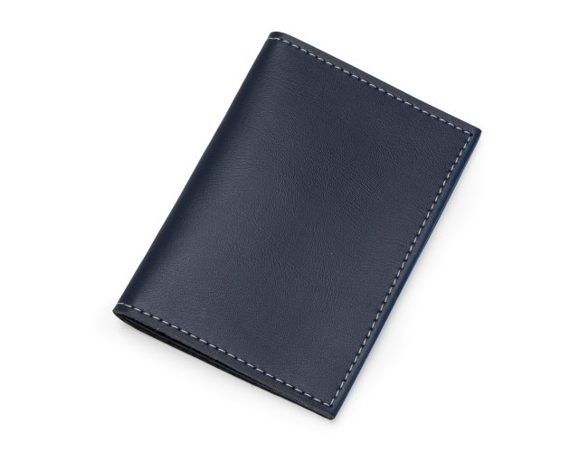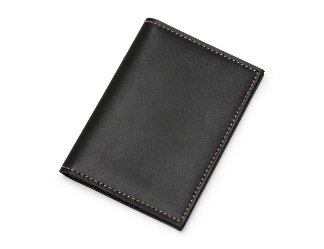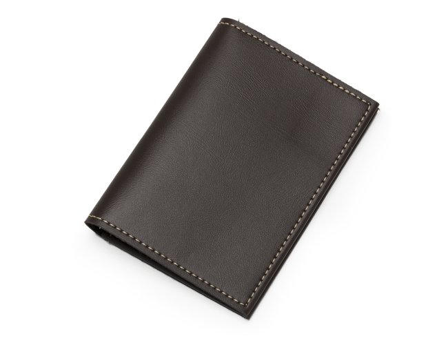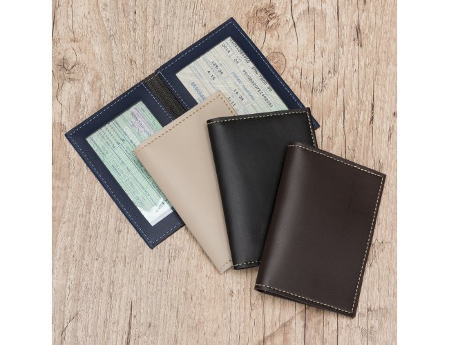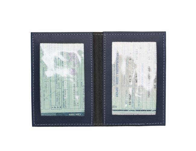 Porta documento em couro sintético, parte interna revestida de veludo e dois “bolsos” com visor plástico.