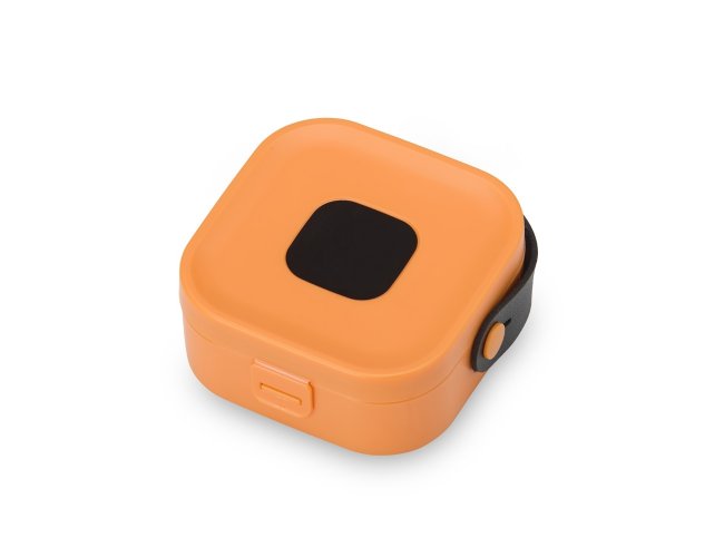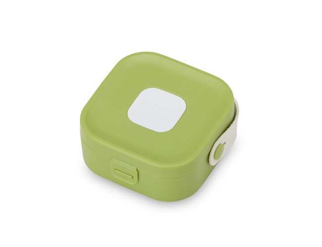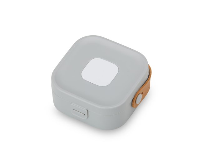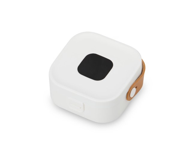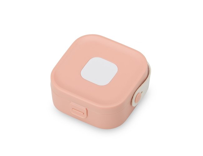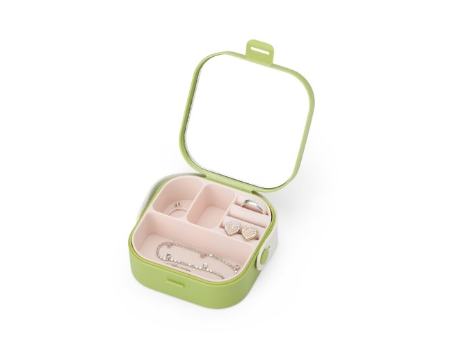 Porta-joias com espelho, produzido em plástico com alça de couro sintético e berço de silicone removível.