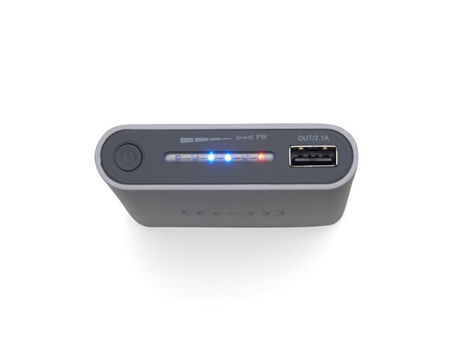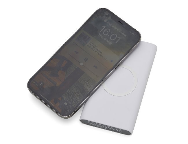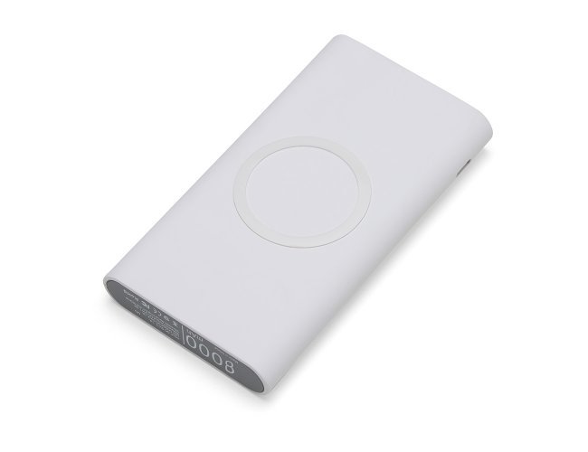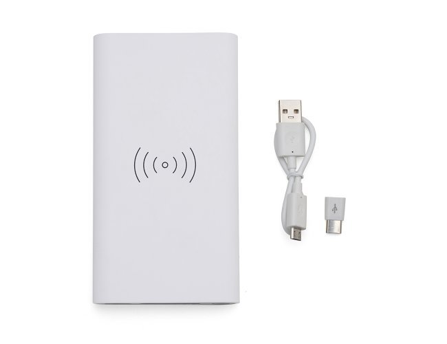 Carregador portátil de indução com 8000mAh e indicadores led de bateria e indução. O carregador contém um detalhe circular emborrachado na área de indução, proporcionado mais segurança ao dispositivo conectado, evitando deslizamentos durante este modo de carga – o lado oposto da indução possui um ícone indutivo, porém é uma mera ilustração, esta área não gera carga. O carregador possui uma porta de saída USB com carga rápida e duas portas de entradas, Tipo-C e V8. Acompanha cabo USB e adaptador Tipo-C.
