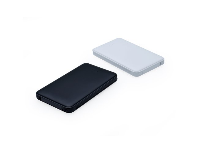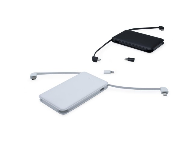 Power bank plástico de 5.000mAh com indicadores led de bateria e cabos acoplados: Tipo-C e V8. Acompanha cabo USB V8 e adaptador Lightning.