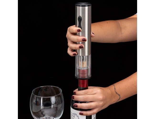Modo de uso: Para utilizar o cortador de lacre, posicione a área com lâminas virada para a garrafa, posteriormente pressione o acessório como se fosse fechá-lo e rotacione a peça para cortar o lacre do vinho. Na área superior do saca rolhas há um compartimento para pilhas com desenhos indicativos de abertura e trava, abra a tampa conforme exibido e insira 4 pilhas AA para o funcionamento do produto. Posicione o saca rolhas sob a garrafa e segure o botão inferior do produto para que seja iniciada a extração da rolha, após a retira desta, segure o botão superior do produto para que a rolha seja removida da parte interna do saca rolhas.