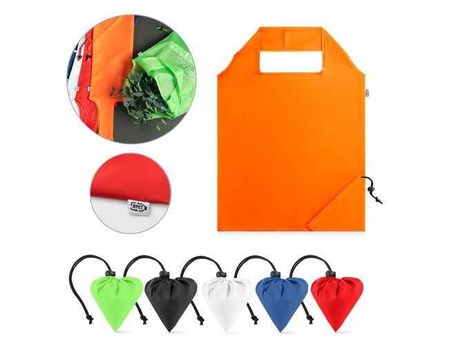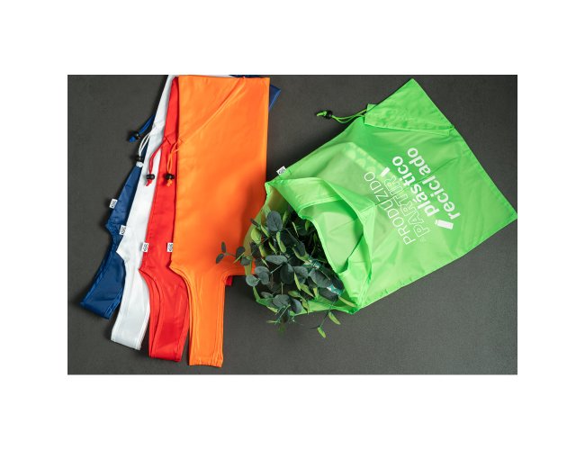 Sacola dobrável em rPET 190T. Produzida a partir de plástico reciclado contribuindo para a redução dos resíduos no meio ambiente. Alças de 40 cm. 370 x 420 mm