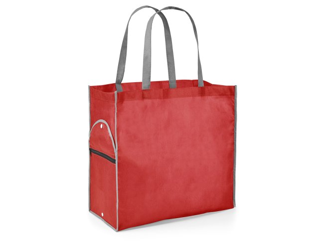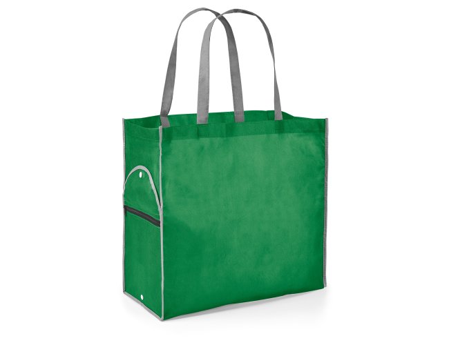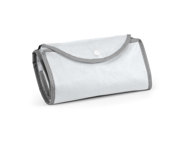 Sacola dobrável em non-woven (80 g/m²) com alças de 65 cm. Fornecida desdobrada. Dobrado: 200 x 120 mm | Aberto: 400 x 450 x 200 mm