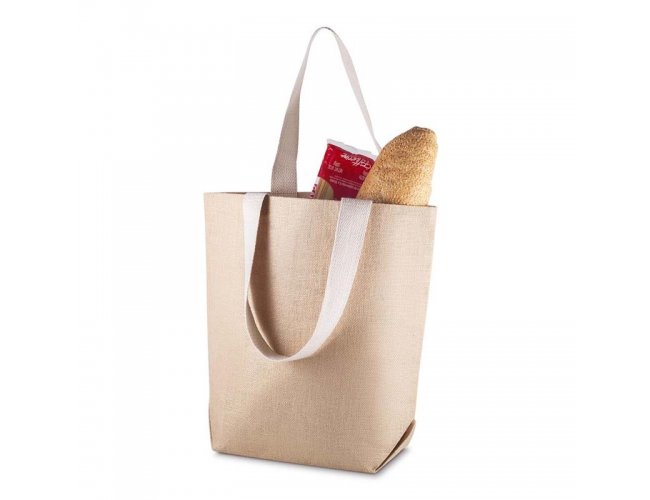 Sacola em Juta 360g/m² com alça em algodão cru e base plana ,interior revestido em plástico PP. Alça com altura de 24 cm, ideal para transporte.