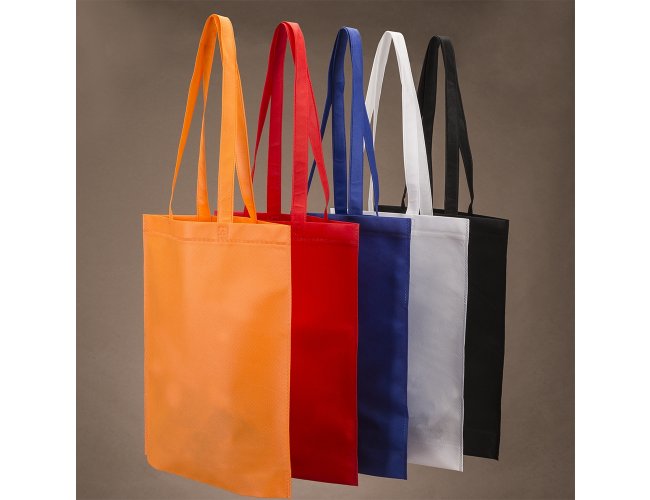 Sacola colorida com alça em material TNT, possui símbolo ecológico/reciclável na costura da alça. Personalizada com a sua logomarca.