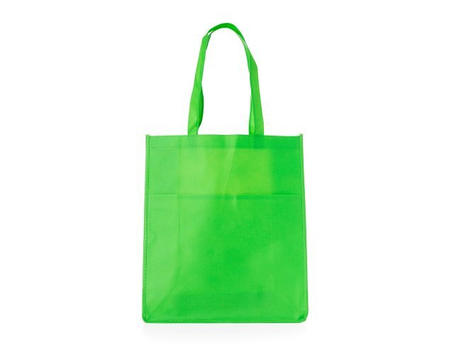 Sacola ecológica com bolso frontal externo e fundo amplo, contém alças para transporte.