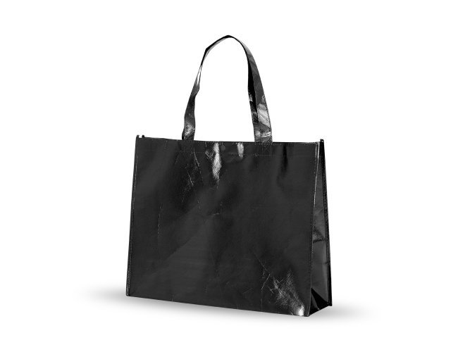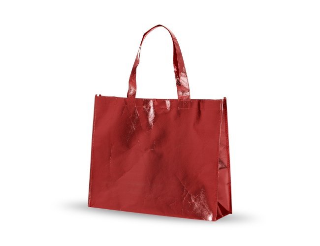 Sacola TNT metalizada com botão. Confeccionado em TNT com revestimento plástico laminado, parte superior possui botão plástico para fecho.