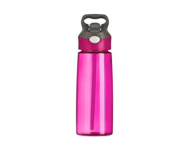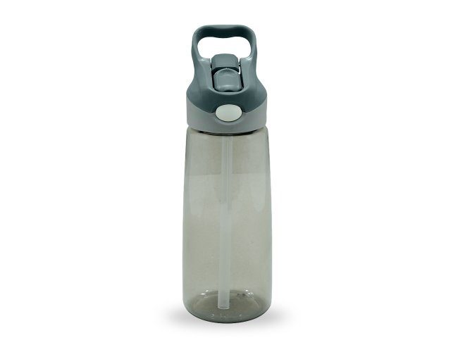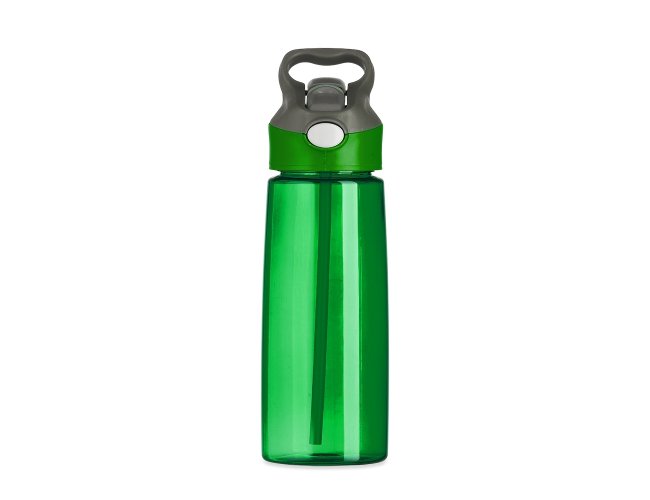 Squeeze 650ml plástico com acionador para abertura. Material plástico transparente, possui tampa rosqueável com alça e botão acionador com proteção plástica para o bico.