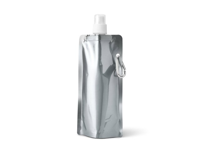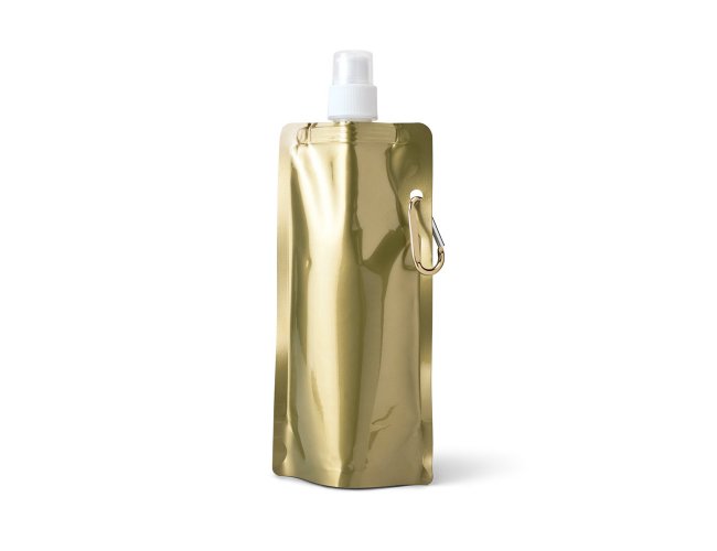 Squeeze dobrável com mosquetão e tampa, com capacidade até 460 ml, disponível em cores metalizadas. Food grade. 110 x 218 x 64 mm