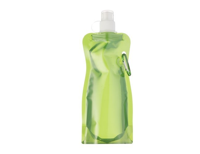 Squeeze dobrável de plástico com 480ml. Squeeze colorido acinturado com mosquetão superior de acordo com a cor do squeeze, possui tampa de bico texturizada e protetor plástico para o bico(com alça).