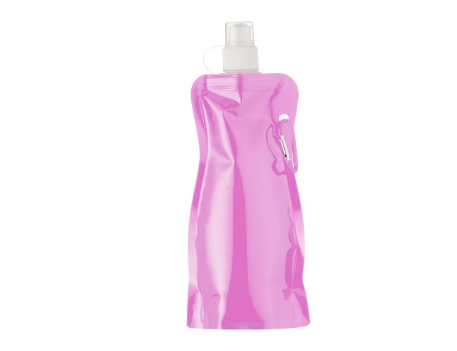 Squeeze dobrável de plástico com 480ml. Squeeze colorido acinturado com mosquetão superior de acordo com a cor do squeeze, possui tampa de bico texturizada e protetor plástico para o bico(com alça).