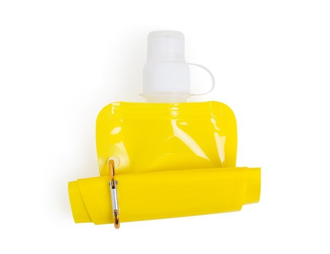 Squeeze dobrável de plástico com 480ml. Squeeze colorido acinturado com mosquetão superior de acordo com a cor do squeeze, possui tampa de bico texturizada e protetor plástico para o bico(com alça).