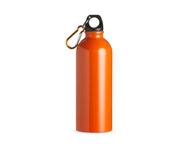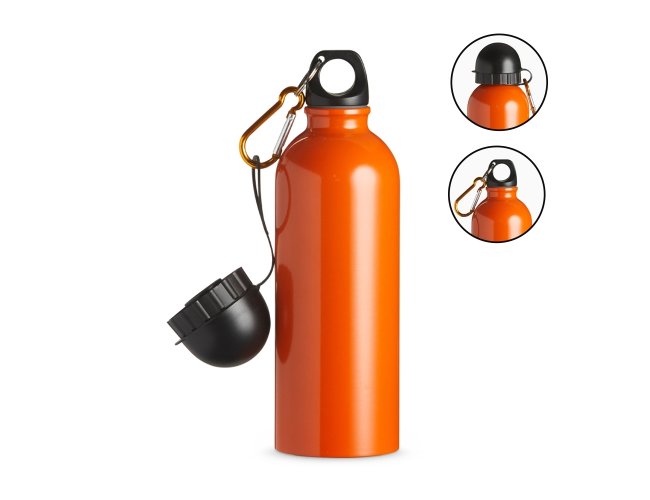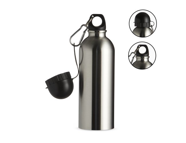 Squeeze 500ml de inox com pintura metalizada, tampa rosqueável e acompanha um segundo bico com mosquetão (não é térmico).
