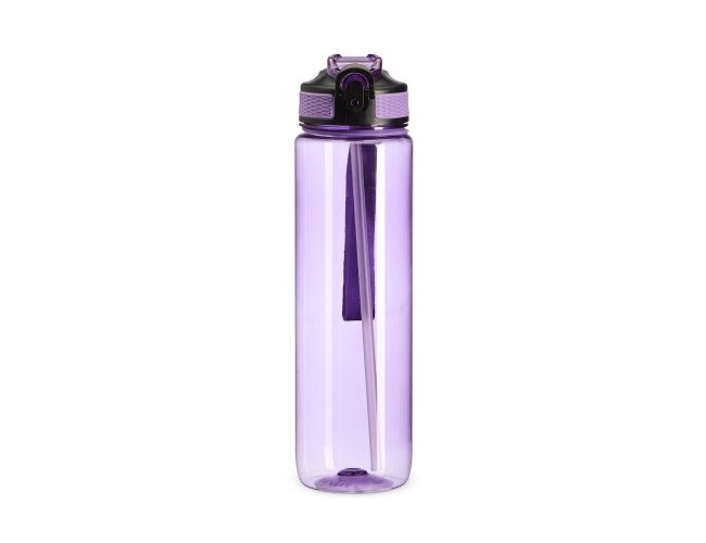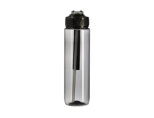 Squeeze plástico com capacidade de 1 litro, livre de BPA. Possui tampa rosqueável com bico de canudo, tampa protetora, botão de acionamento e trava de segurança. Acompanha cordão de nylon e canudo.
