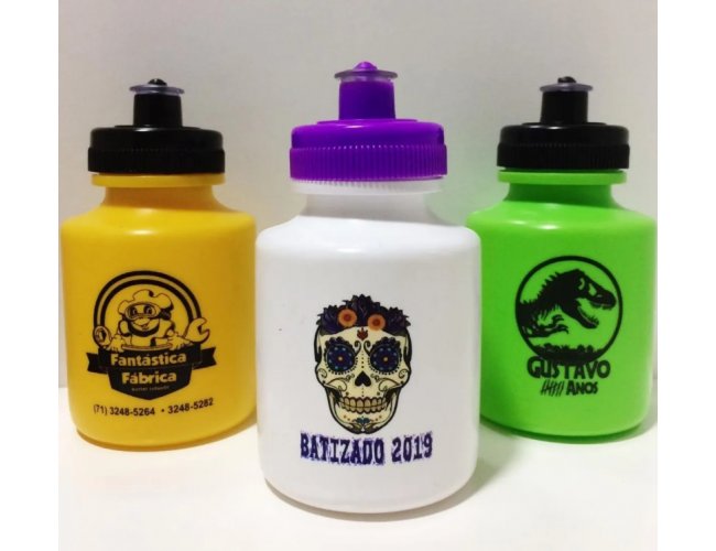 Squeeze Plástico 300 ml Personalizado. Capacidade: 300 ml. Tamanho: 12,5 cm X 6,5 cm. Fabricado em Polietileno de Alta Densidade (PEAD) e tampa de bico (silicone).
