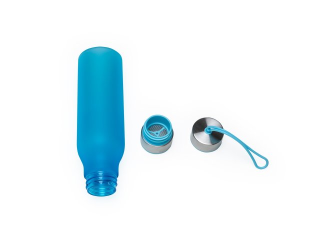 Squeeze plástico fosco de 600ml com tampa de peneira. Garrafa colorido fosco com tampa inox, possui peneira na parte interna e ambas tampas podem ser rosqueáveis. Acompanha alça elástica.