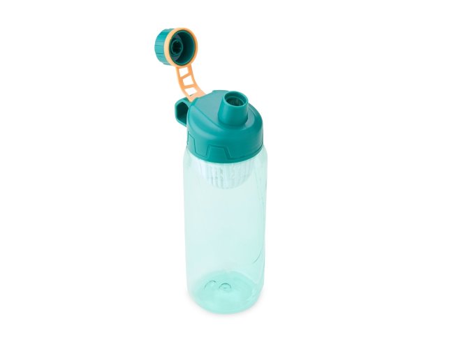 Squeeze plástico 800ml com infusor de bebidas. Com design em relevo, a squeeze possui tampa rosqueável com alça para transporte e tampa de proteção para o bocal.