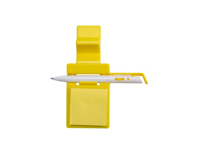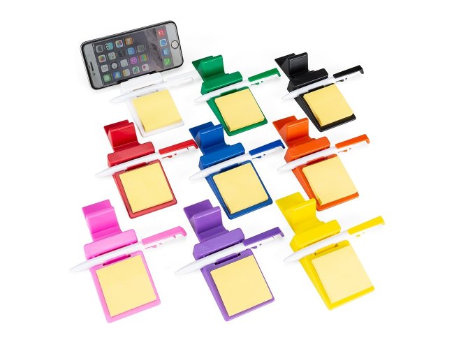 Suporte plástico para celular com caneta plástica e bloquinho de rascunho. Suporte colorido com encaixe para caneta e celular, acompanha bloquinho amarelo com aproximadamente 50 folhas e caneta plástica branca com detalhes coloridos(acompanha na mesma cor do suporte), aciona por clique e para destravar basta apertar a parte inferior do clip.