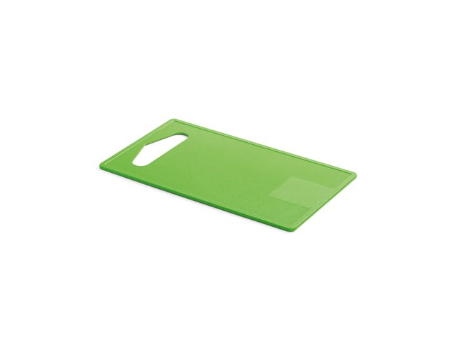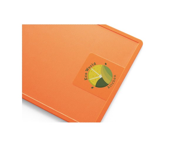 Tábua de corte em fibra de bambu (50%) e PP (50%). Contém um quadrado liso no fundo da tábua, adequado para a personalização.