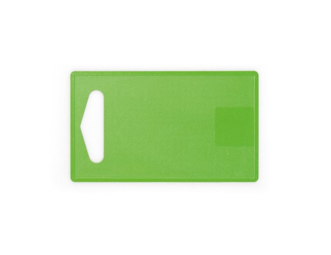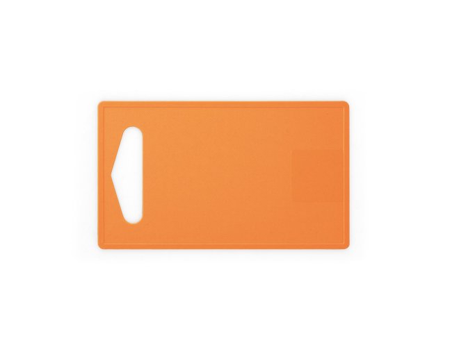Tábua de corte em fibra de bambu (50%) e PP (50%). Contém um quadrado liso no fundo da tábua, adequado para a personalização.