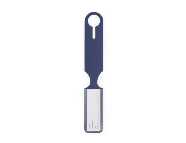 Tag identificador de bagagem em couro sintético. Parte frontal com abertura para visor plástico e verso liso.