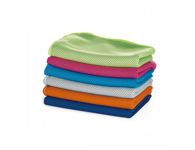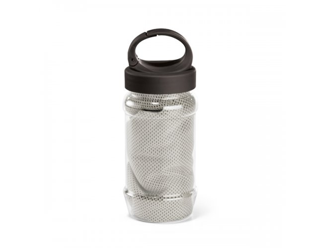 Toalha para esporte. Toalha: poliamida e poliéster. Garrafa: PP e PET. Toalha refrescante, quando molhada permanece fria durante horas. Se aquecer, basta balançar reativando sua frescura. Reutilizável e lavável à máquina. Garrafa com mosquetão inclusa (food grade). Capacidade até 440 ml. Toalha: 300 x 800 mm | Garrafa: ø65 x 125 mm